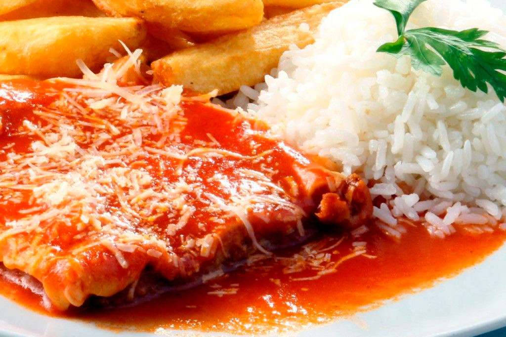 É preparado com um bife macio e suculento, que é empanado e frito até alcançar uma casquinha dourada e crocante. Em seguida, ele é coberto com um saboroso molho de tomate caseiro e uma generosa camada de queijo muçarela.
